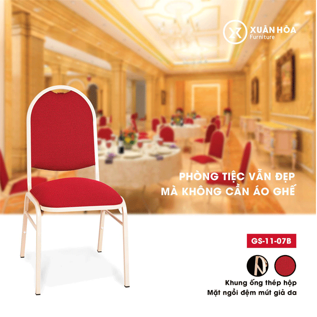 Ghế phòng tiệc của Xuân Hòa được gia công kỹ lưỡng đến từng chi tiết nhỏ với chất liệu khung thép siêu bền kèm theo sắc đỏ cổ điển sang trọng và có thể sử dụng mà không cần áo ghế.